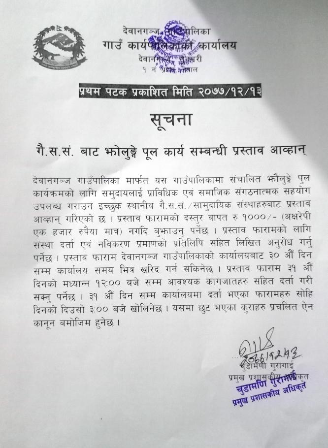 गै.स.सं. बाट झोलुंगे पुल कार्य सम्बन्धि प्रस्ताव आव्हान